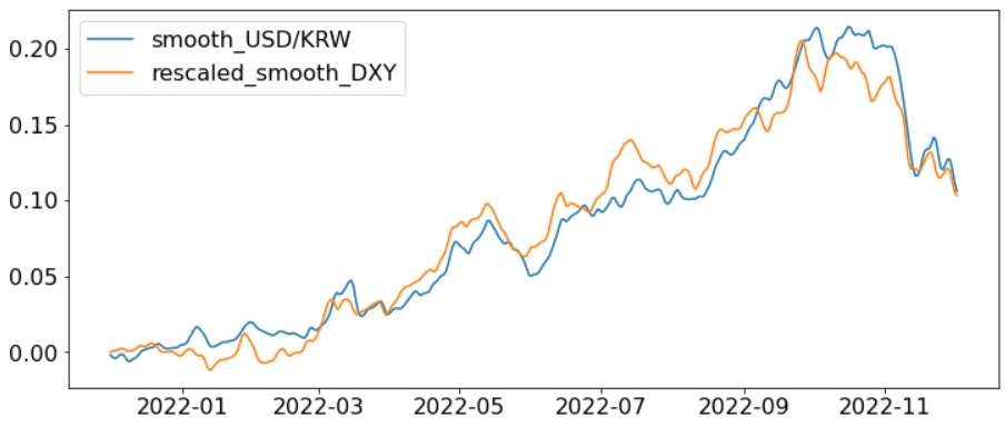 regression의 계수 1.1062를 곱하니 어느 정도 달러 환율에 페깅되는 것을 확인할 수 있었다.