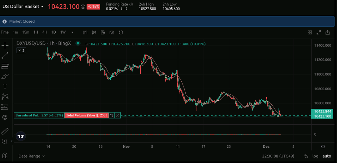 [BingX 거래소의 달러 인덱스 선물. 기존 지표 수치에 100이 곱해져있다.]