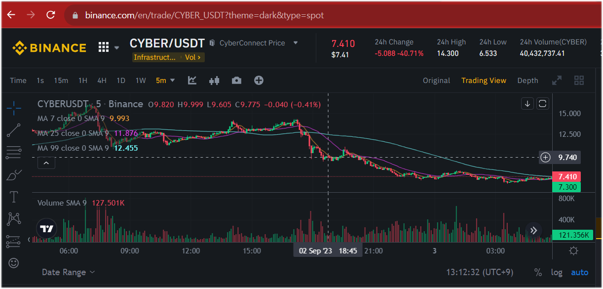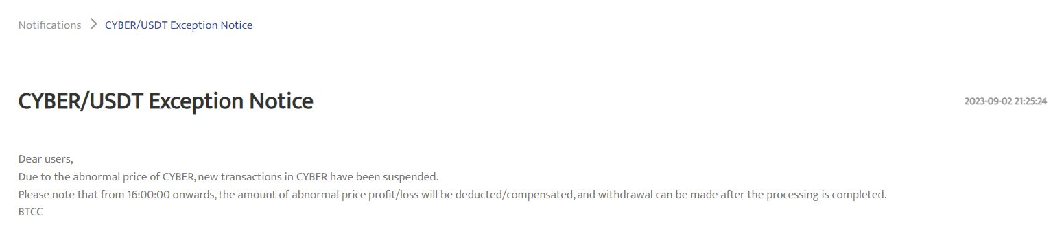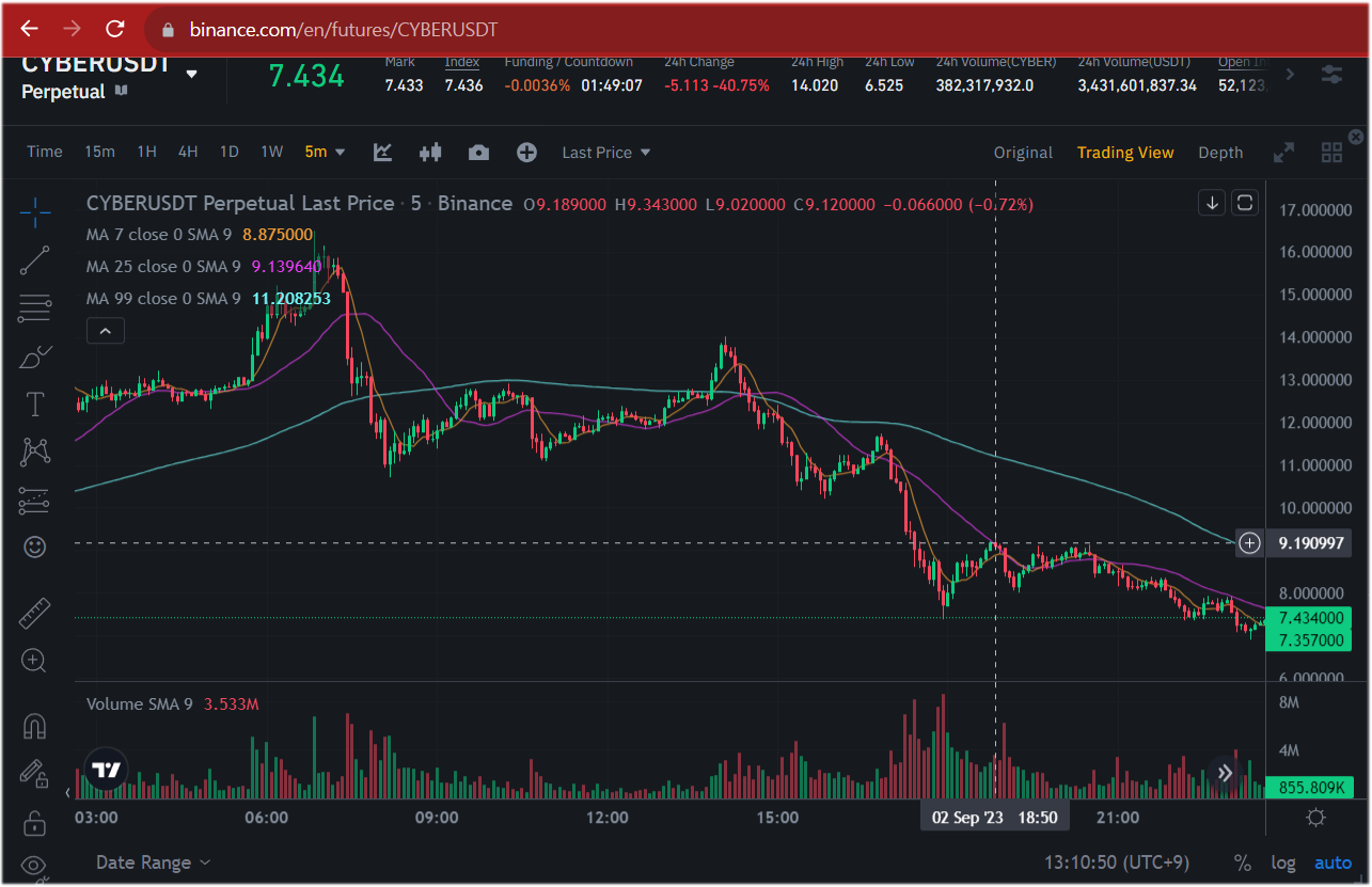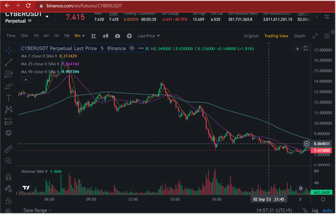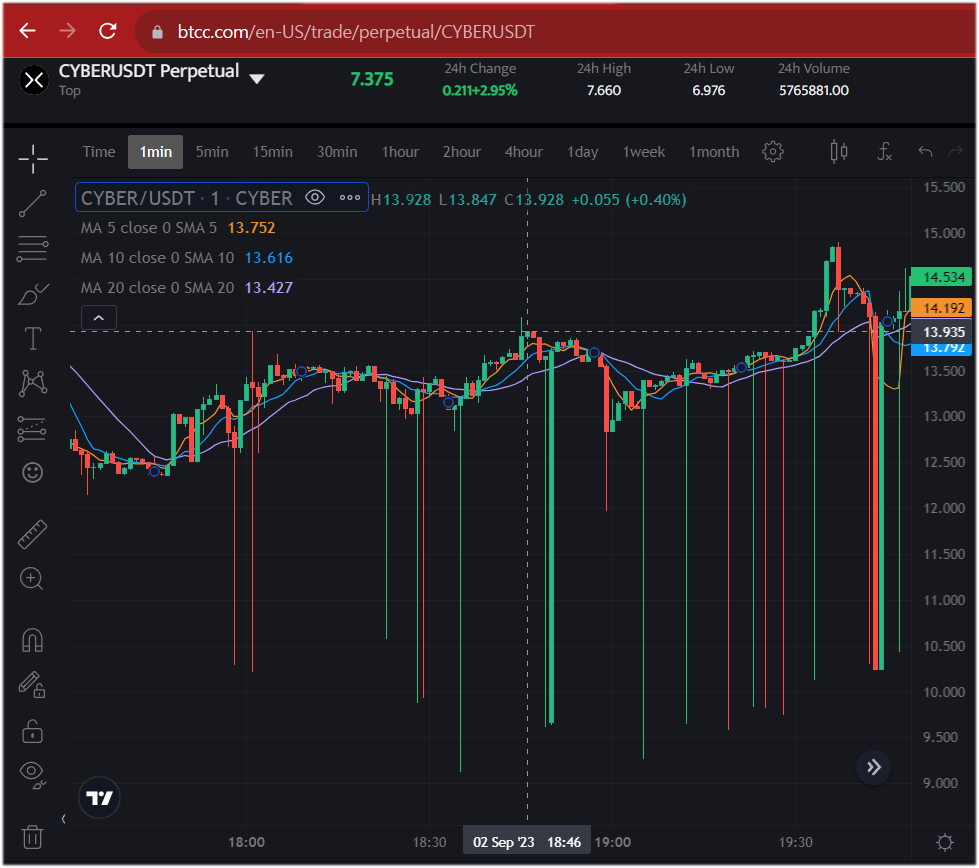 위 대화에서 언급한대로 2023년 9월 2일 16시 45분 (UTC+9) 경, btcc의 cyber 가격은 **13.9** 정도였고 바이낸스를 비롯한 다른 거래소들의 선물 가격은 **9.19** 정도로, **51% 이상의 가격 차이**가 있었습니다.