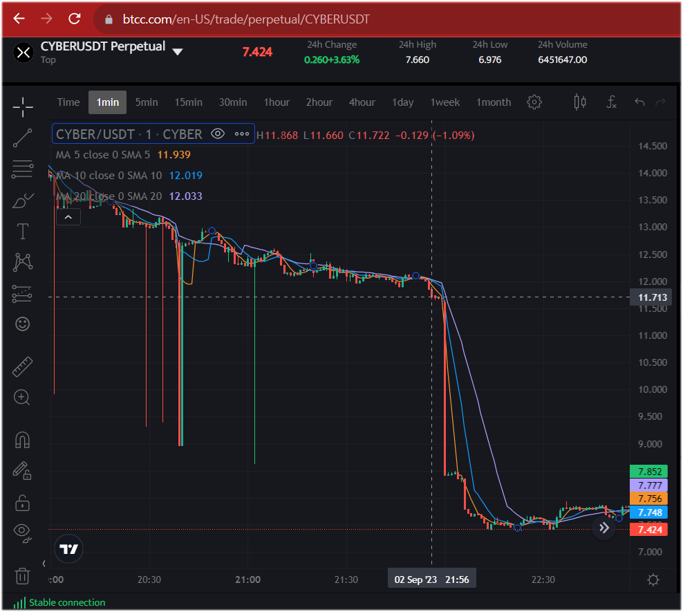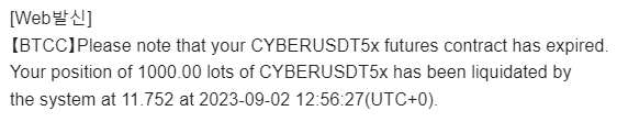 해당 시간대의 정상적인 cyber 가격은 8불 정도 였지만, btcc에서는 자기네들의 잘못된 가격 기준인 11.752불에서 제 포지션을 모두 청산시켰습니다.