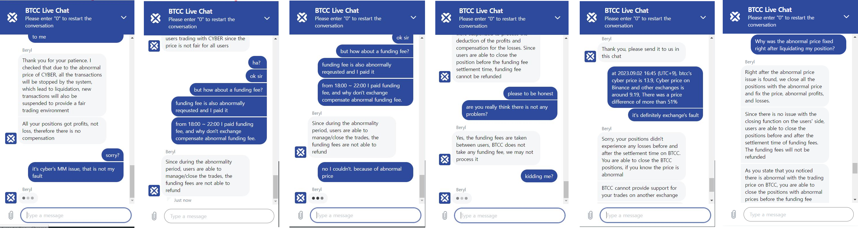 다른 거래소와 가격 차이가 많이 난 것은 알겠으나, 어찌됐건 btcc 쪽에서 loss가 발생하지 않았기 때문에 책임지지 않는다. 원래 가격대로라면 수익이 크게 날 수 있었던 부분 또한 btcc가 알 바 아니다.