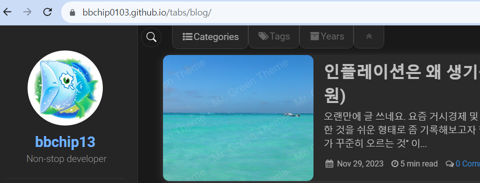 아직 jekyll 테마 기본 이미지인지라 워터마크가 떡하니 박혀있다.